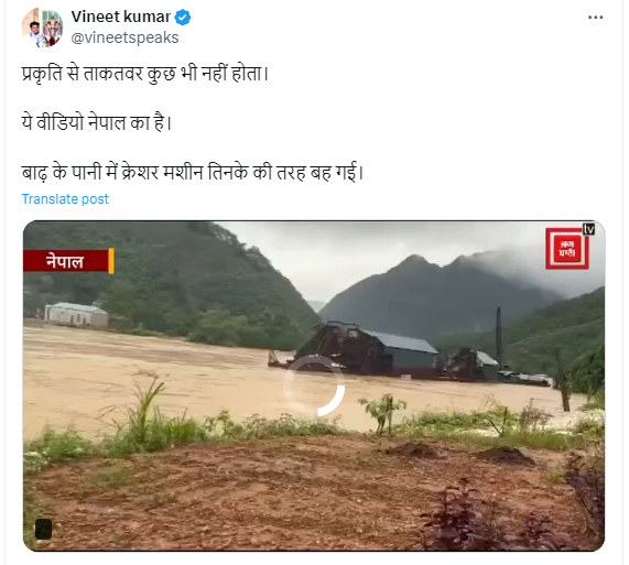 ਨੇਪਾਲ ਵਿੱਚ ਹੜ੍ਹ ਅਤੇ ਜ਼ਮੀਨ ਖਿਸਕਣ ਕਾਰਨ ਕਈ ਇਲਾਕਿਆਂ ਵਿੱਚ ਜਨਜੀਵਨ ਪ੍ਰਭਾਵਿਤ ਹੋ ਗਿਆ ਹੈ। ਇਸ ਦੌਰਾਨ ਪਾਣੀ ਦੇ ਵਿੱਚ ਮਸ਼ੀਨਾਂ ਦੇ ਬਹਿੰਦਿਆਂ ਦਾ ਇੱਕ ਵੀਡੀਓ ਸੋਸ਼ਲ ਮੀਡੀਆ ‘ਤੇ ਵਾਇਰਲ ਹੋ ਰਿਹਾ ਹੈ। ਦਾਅਵਾ ਕੀਤਾ ਜਾ ਰਿਹਾ ਹੈ ਕਿ ਇਹ ਵੀਡੀਓ ਨੇਪਾਲ ਦਾ ਹੈ।