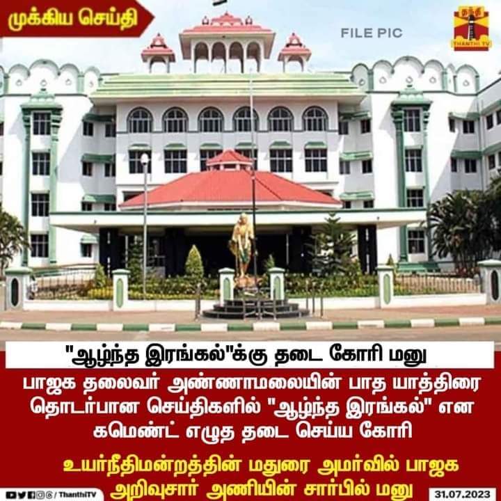 “ஆழ்ந்த இரங்கல்-க்கு தடை கோரி மனு. பாஜக தலைவர் அண்ணாமலையின் பாத யாத்திரை தொடர்பான செய்திகளில் “ஆழ்ந்த இரங்கல்” என கமெண்ட் எழுத தடை செய்ய கோரி உயர்நீதிமன்றத்தின் மதுரை அமர்வில் பாஜக அறிவுசார் அணியின் சார்பில் மனு” என்று இந்த நியூஸ்கார்ட் பரவி வருகிறது.