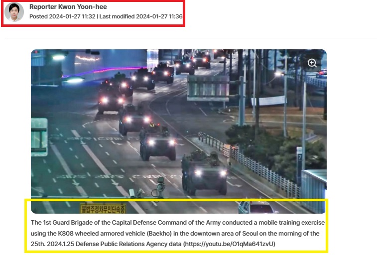 کے ایف این نیوز نامی یوٹیوب چینل پر ایک ویڈیو رپورٹ موصول ہوئی۔ جس میں وائرل تصویر جیسے منظر دیکھے جا سکتے ہیں “25 تاریخ کو، ایک درجن سے زیادہ بکتر بند گاڑیاں صبح کے وقت سیول شہر میں داخل ہوئیں۔ آرمی واٹر ڈیفنس کور نے پہیوں سے چلنے والی بکتر بند گاڑیاں ‘بایخو’ موبائل مشق کی ہے۔ شہریوں کو تکلیف نہ ہو اس لئے صبح کے وقت شہر کے مرکز میں داخل ہوئے اور مشق کی۔ (کورین سے گوگل کے ذریعے ترجمہ کیا گیا)۔ اس حوالے سے دیگر میڈیا رپورٹ یہاں پڑھ سکتے ہیں۔