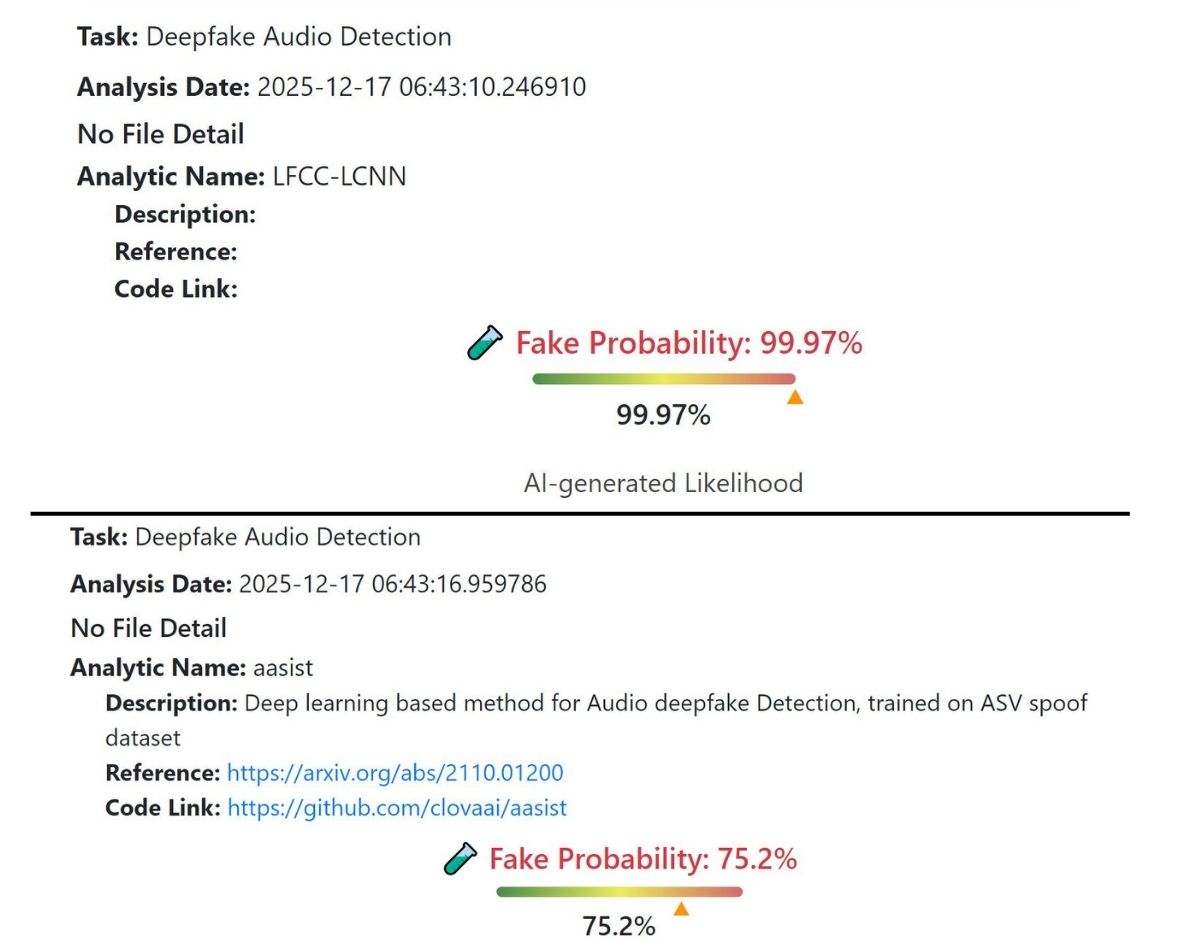 Similarly, the DeepFake-O-Meter developed by the UB Media Forensics Lab at the University at Buffalo, marked the audio as fake, with two of its analytic outputs rating it 99.97 percent and 75.2 percent likely to be AI-generated.