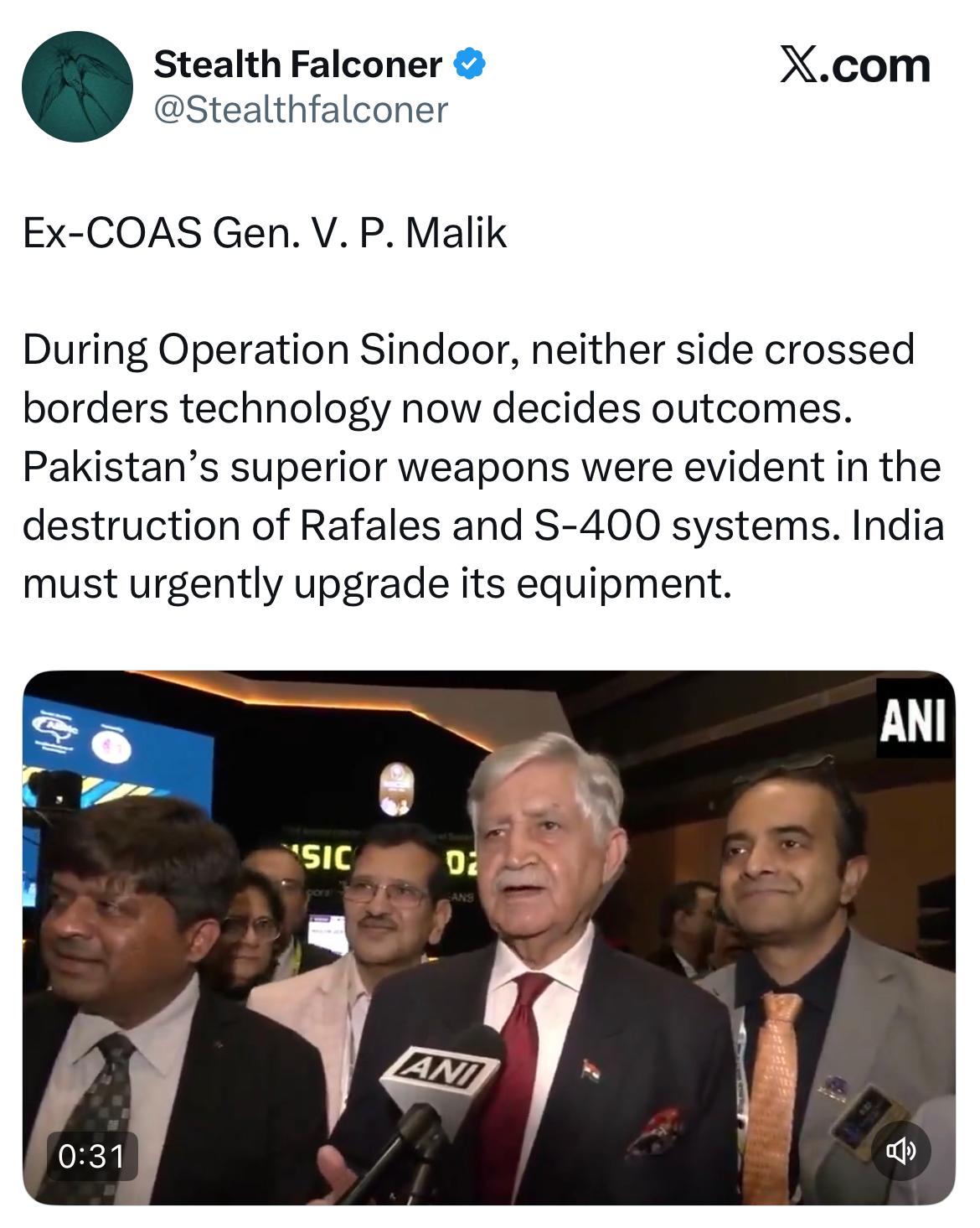 Former Indian Army chief Gen. VP Malik (Retd) says Pakistan has better weapons and equipment, and that the destruction of Rafale jets and the S-400 system proves its superiority over India.