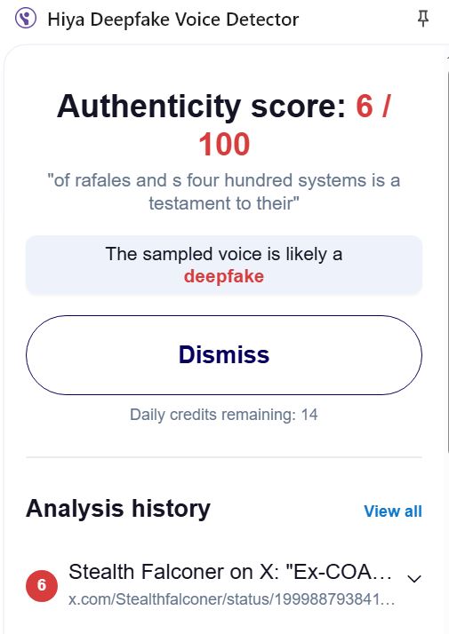 Newschecker analysed the viral clip using two independent deepfake detection tools, both of which confirmed that the audio had been manipulated. The Hiya Deepfake Voice Detector gave the voice an authenticity score of just 6 out of 100, indicating a very high likelihood of AI-generated manipulation.