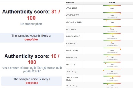 Deepfake-O-Meter: Seven out of 12 detection models indicated high probability of AI manipulation, with some classifiers marking it 99%–100% fake.