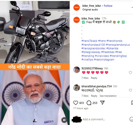 Video claiming to show PM Narendra Modi announcing a special government scheme for Chhath Puja where citizens can get a Splendor motorcycle for free. The PM purportedly urges everyone to like the video and to fill a form available upon pressing a link to book the vehicle.