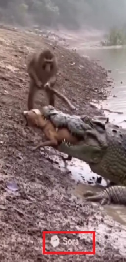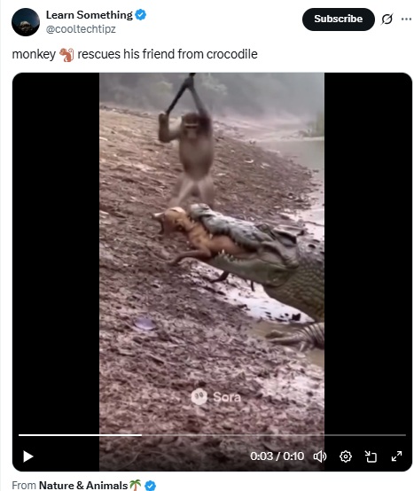 A 10-second video showing a monkey rescuing a dog from the jaws of a crocodile.