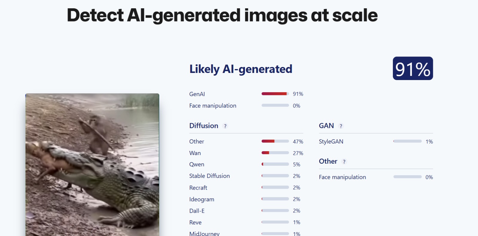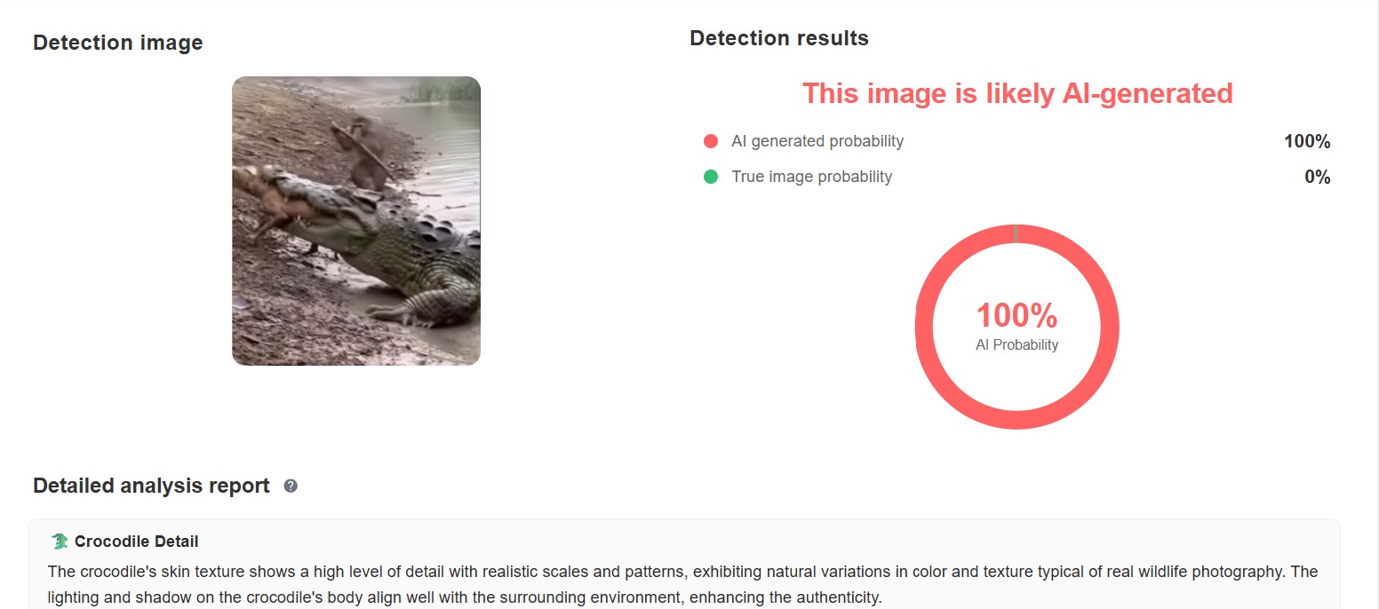 We then ran screengrabs of the video past AI-content detection tools such as WasitAI, SightEngine and Decopy AI, which found high probability of the video being AI-generated.