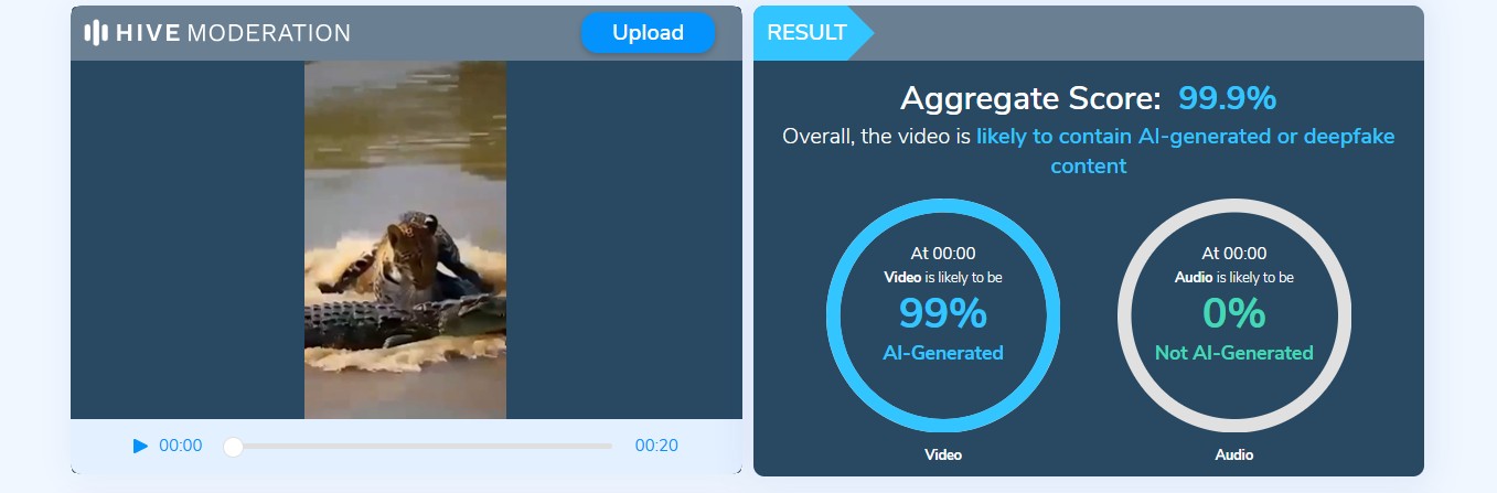 To verify further, we processed a portion of the clip using Hive Moderation’s AI-detection tool, which returned a 99.9% likelihood that the media was AI-generated or deepfake in nature.