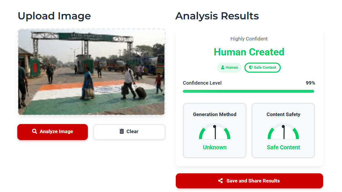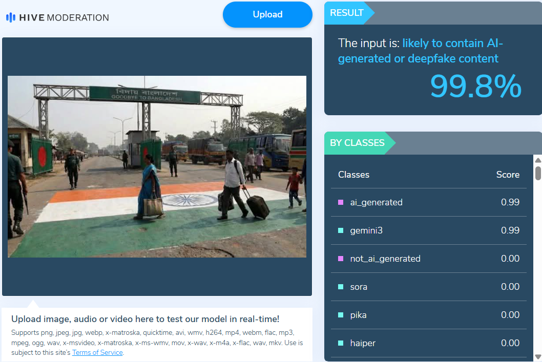 এরপর Hive Moderation ও Is it AI টুলের সাহায্যে ভাইরাল ছবিটির পরীক্ষা করলে দেখা যায় যে, ভাইরাল ছবিটি ৯৯ শতাংশ কৃত্রিম বুদ্ধিমত্তা বা AI দ্বারা তৈরি।
