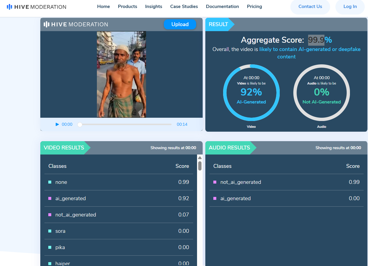 Hive Moderation টুলের সাহায্যে ভিডিয়োটির পরীক্ষায়, AI দ্বারা তৈরির সম্ভাবনা ৯০ শতাংশের চেয়ে বেশি ধরা পড়ে।