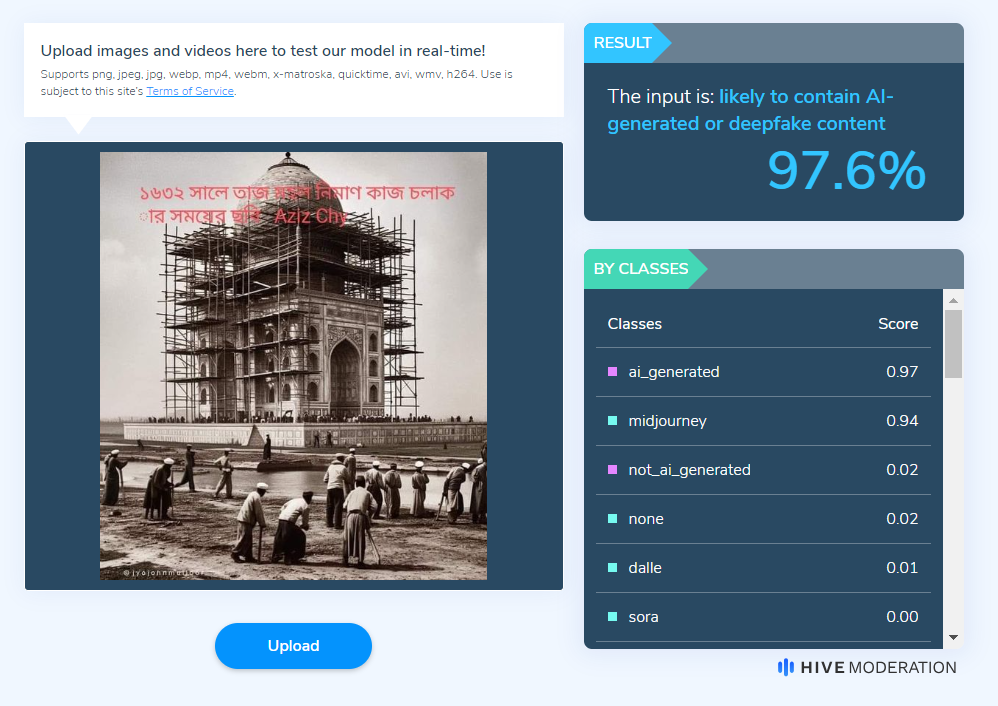 এরপর Hive Moderation Tool-এর সাহায্যে অনুস্ধান করলে, তাতেও ধরা পড়ে যে ছবিট আর্টিফিসিয়াল ইন্টেলিজেন্স (AI) দ্বারা তৈরি।
