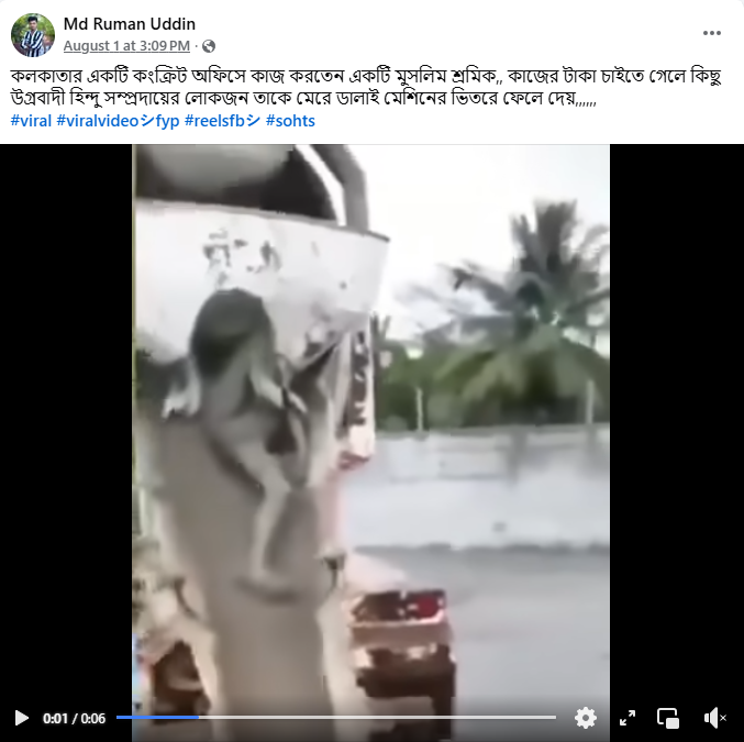 কলকাতার একটি অফিসে কর্মরত এক মুসলিম শ্রমিককে মেরে, ঢালাই মেশিনের মধ্যে ফেলে দেয় উগ্র হিন্দুত্ববাদী সম্প্রদায়ের লোকজনরা।
