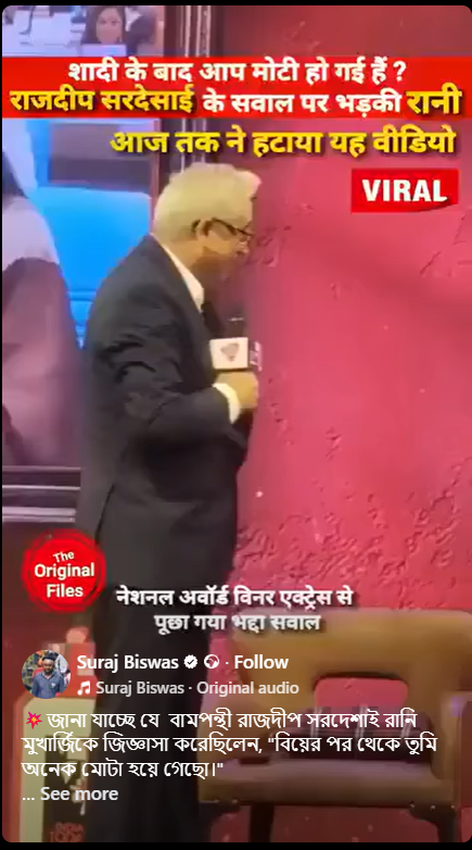 একটি ভিডিয়ো সোশ্যাল মিডিয়ায় পোস্ট করে দাবি করা হয়েছে যে, সাংবাদিক রাজদীব সারদেশাইয়ের প্রশ্ন শুনে ক্ষিপ্ত হয়ে যান অভিনেত্রী রানি মুখোপাধ্যায় এবং চলন্ত শোয়ের মধ্যেই সাংবাদিককে অপমান করেনি তিনি। ভিডিয়োটির সঙ্গে ফেসবুকে লেখা হয়েছে, “জানা যাচ্ছে যে বামপন্থী রাজদীপ সরদেশাই রানি মুখার্জিকে জিজ্ঞাসা করেছিলেন, “বিয়ের পর থেকে তুমি অনেক মোটা হয়ে গেছো।” রানি মুখার্জি TMC সাংসদ সাগরিকা ঘোষ বর রাজদীপ সারদেশাই কে সেখানেই কুকুরের মতো তিরস্কার করেছিলেন। ভিডিওটি দ্রুত এডিট করা হয়েছিল এবং এই অংশটি দেখানো হয়নি।”