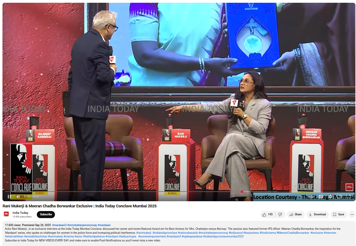 ৪৮ মিনিট দীর্ঘ ভিডিয়োর একটি অংশে দেখা যায়, সাংবাদিক রাজদীপ সারদেশাই, জাতীয় পুরস্কার-জয়ী অভিনেত্রী রানি মুখোপাধ্যায়ের সাক্ষাৎকার নিয়েছিলেন। “মার্দানি” ও “মিসেস চ্যাটার্জি ভার্সেস নরওয়ে”-র মতো সিনেমায় তাঁর চরিত্র নিয়ে কথা বলেছিলেন। ওই সাক্ষাৎকারের একটি অংশ প্রাক্তন আইপিএস অফিসার মীরা চাড্ডা বোরয়ানকারের কথাও বলতে শোনা যায়। যাঁর জীবনের উপর ভিত্তি করে “মার্দানি” সিনেমাটি তৈরি করা হয়। ওই অনুষ্ঠানের একটি অংশে সাংবাদিক রাজদীপ সারদেশাই, রানি মুখোপাধ্যায়কে “মার্দানি” সিনেমার একটি সিন অভিনয়ের জন্য অনুরোধ করেন।