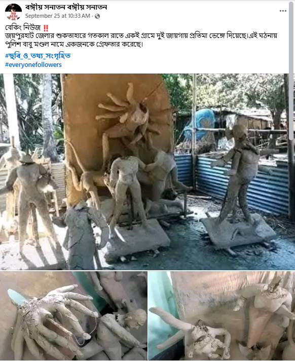 দুর্গাপুজোর আবহে কয়েকটি ভাঙা প্রতিমার ছবি সোশ্যাল মিডিয়ায় পোস্ট করে একাংশ দাবি করেছে যে, অতি সম্প্রতি বাংলাদেশের জয়পুরহাট জেলার শুকতাহারে, একই গ্রামে দুই জায়গায় প্রতিমা ভেঙে দেওয়া হয়েছে এবং পুলিশ বাবু মণ্ডল নামে একজনকে গ্রেফতার করেছে।