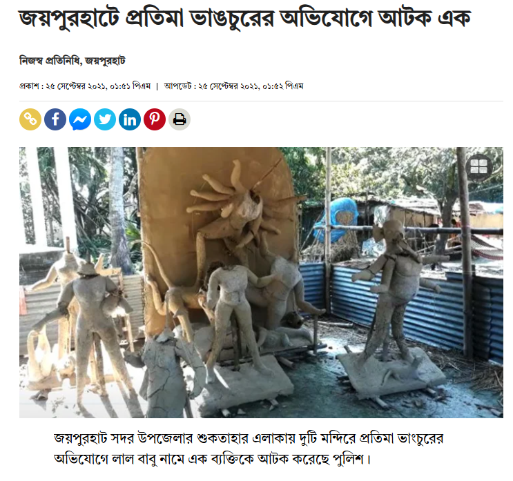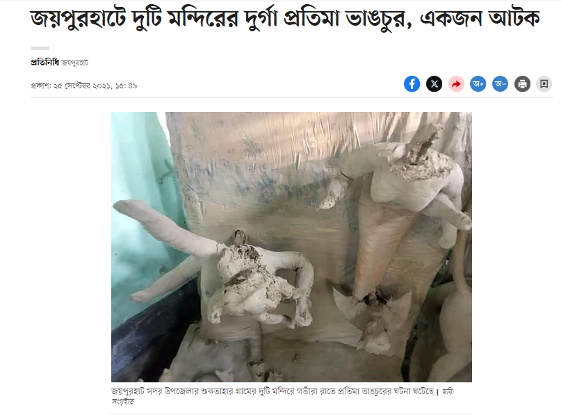 প্রশ্ন ৪: সাম্প্রতিক সময়ে জয়পুরহাটে প্রতিমা ভাঙচুরের কোনো খবর কি আছে?