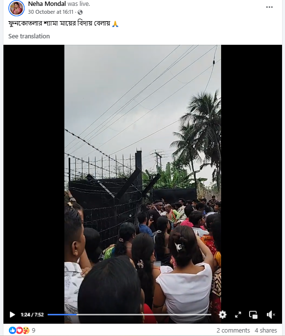 তদন্ত আরও এগিয়ে আমরা মুরুটিয়া থানার স্টেশন ইনচার্জ নির্মলায় দত্তের সঙ্গে যোগাযোগ করি। তিনি বলেন, “এই ভিডিয়োটি ৩০শে অক্টোবর ফুঙ্কোটলায় কালী বিসর্জন অনুষ্ঠানের। মাথাভাঙ্গা নদী এই এলাকায় ভারত-বাংলাদেশ সীমান্ত ধরে প্রবাহিত। বছরের পর বছর ধরে, মানুষ কালী বিসর্জনের জন্য নদীর তীরে নিমতলা ঘাটে যান। আগে, নদীতে প্রবেশের জন্য কোনও বেড়া বা কাঁটাতারের বেড়া ছিল না। তবে, এই বছর, বেড়া দেওয়া হয়েছিল, তাই লোকেরা গেট খুলে নদীর তীরে গিয়েছিল।”