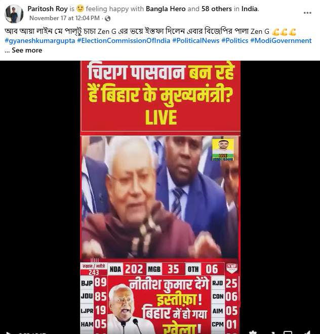 একই সময়, CNN News18 ও Hindustan Times-এর ভিডিয়ো সংবাদ প্রতিবেদন থেকেও জানা গিয়েছে যে, সেবার আরজেডি-র সঙ্গে জোট ভেঙে বেরিয়ে এসেছিলেন নীতীশ কুমার। ২০২৪ সালের লোকসভা ভোটের আগে, ফের বিজেপিকে সঙ্গে নিয়ে সরকার গড়েছিলেন তিনি।