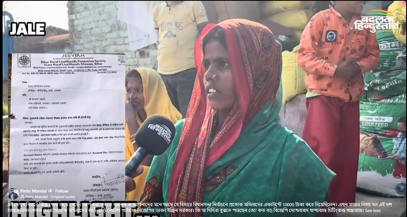 এই পরিপ্রেক্ষিতে সোশ্যাল মিডিয়ায় ভাইরাল একটি ভিডিয়োতে দাবি করা হচ্ছে যে, প্রত্যেক জীবিকা দিদিকে দেওয়া সেই ১০ হাজার টাকা ফেরত চেয়ে এবার নোটিস পাঠাচ্ছে নীতীশ কুমারের নেতৃত্বাধীন বিহারের এনডিএ সরকার। ওই ভিডিয়োতে সাংবাদিককে কয়েকজন মহিলা বলছেন যে, সেই ১০ হাজার টাকা খরচ করে ফেলেছেন। তাই টাকা ফেরত দিতে পারবেন না। ভিডিয়োতে একটি নোটিসের চিঠিও দেখানো হচ্ছে।