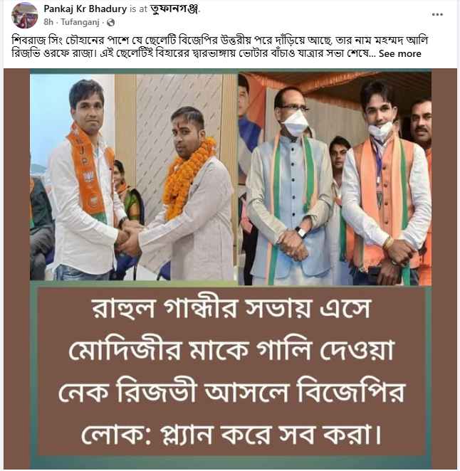 ফেসবুকে ছবির কোলাজটি পোস্ট করে অনেকেই অভিযোগ করেছে যে, রিজভি নামের যে ব্যক্তি প্রধানমন্ত্রীকে কটূক্তি করেছে, সে আসলে বিজেপিরই সমর্থক। রাহুল গান্ধীর (Rahul Gandhi) ‘ভোটার অধিকার যাত্রা’কে (Voter Adhikar Yatra) ভয় পেয়ে, গেরুয়া শিবির পরিকল্পনায়, সে কাণ্ডটি ঘটিয়েছে।
