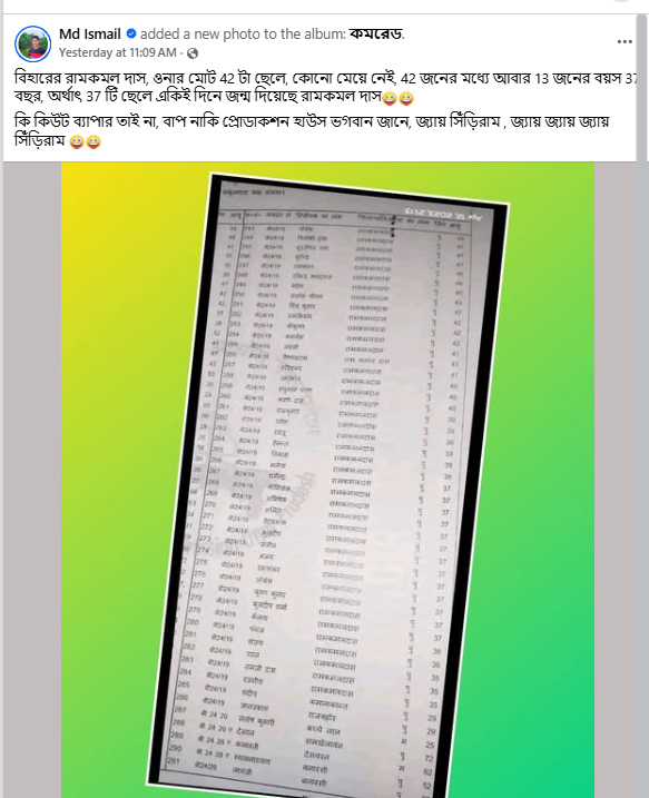 এই পরিস্থিতিতে, ভোটার তালিকার একটি ছবি সোশ্যাল মিডিয়ায় বর্তমানে খুব ভাইরাল হচ্ছে। ছবিটি পোস্ট করে অনেকেই দাবি করছেন যে, ৪২ জন ভোটারের পিতৃ পরিচয়ের স্থানে, বিহারের বাসিন্দা রামকমল দাস নামে একজন ব্যক্তির উল্লেখ রয়েছে। এর মধ্যে ১৩ জন সন্তানের জন্ম একই বছরে হয়েছে এবং এদের সকলের বয়স ৩৭ বছর। সেই ভোটার তালিকার ছবি ফেসবুকে পোস্ট করে সোশ্যাল মিডিয়ার ব্যবহারকারীরা নির্বাচন কমিশনের বিশ্বাসযোগ্যতা নিয়ে প্রশ্ন তুলছেন।