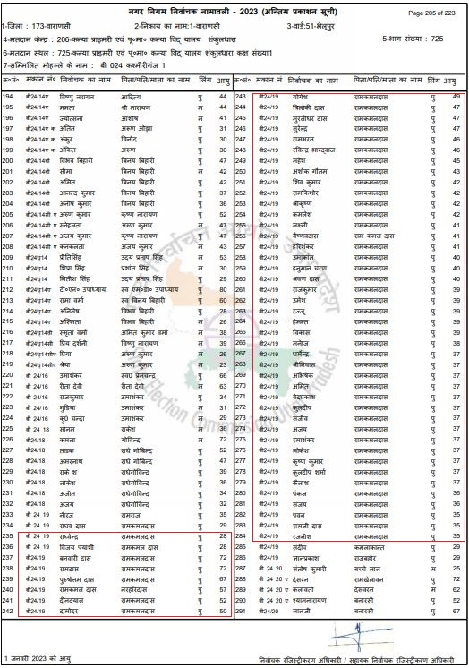 এরপর, আমরা উত্তরপ্রদেশ রাজ্য নির্বাচন কমিশনের ওয়েবসাইটে গিয়ে ২০২৩ সালের পুরসভা নির্বাচনের সময় প্রকাশিত বারাণসী পুরসভার ৫১ নম্বর ভেলুপুর ওয়ার্ডের ভোটার তালিকাটি পরীক্ষা করি এবং দেখতে পাই যে, বাড়ি নম্বর বি, ২৪/১৯ এর অধীনে মোট ৫১ জন ভোটারের নাম নথিভুক্ত রয়েছে। যার মধ্যে ৪৮ জন ভোটারের বাবা হিসেবে রামকমল দাসের নাম লেখা রয়েছে। তার মধ্যে ১৩ জনের বয়স ৩৭ বছর, পাঁচজনের বয়স ৩৯ বছর, চারজনের বয়স ৪০ বছর, বাকিদের বয়স ৪২ বছর।