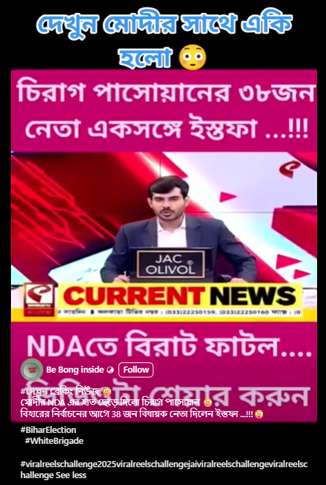 এখানে স্থানীয় নেতাদের ইস্তফার খবরকে সোশ্যাল মিডিয়ায় বিকৃত করে “বিধায়কদের ইস্তফা” ও “এনডিএ ত্যাগ” বলে প্রচার করা হয়েছে। অথচ, বাস্তবে এলজেপি-র হাতে মাত্র একটি বিধায়ক আসন রয়েছে—তাই ৩৮ জন বিধায়ক ইস্তফা দেওয়া অসম্ভব দাবি।