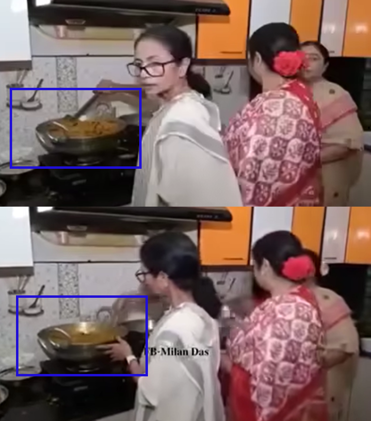 ভাইরাল ভিডিয়োর শুরুর দিকের ফ্রেমের সঙ্গে পরের ফ্রেমগুলোর পার্থক্য লক্ষ্য করা যায়। প্রথম দিকের ফ্রেমের কড়াইটি ভর্তি থাকলেও, পরে সেটিকে অনেকটা খালি দেখায়। ফলে সেখান থেকেই ভাইরাল ভিডিয়োটি মনে সন্দেহ তৈরি করে।