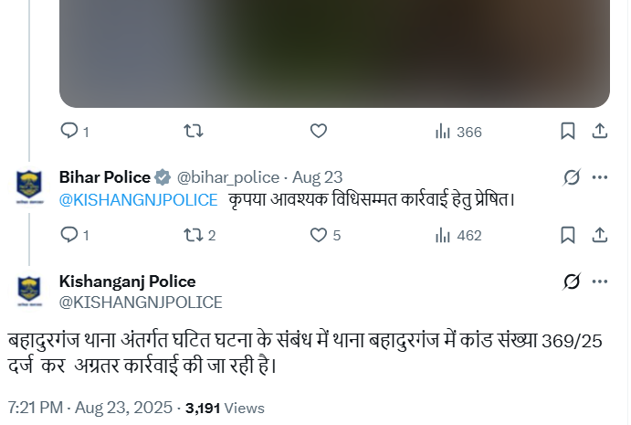 ভিডিওটি পোস্ট হওয়ার পর কিষাণগঞ্জ পুলিশ এক্স হ্যান্ডেলে রিপ্লাই দিয়ে জানায়, ঘটনাটি বাহাদুরগঞ্জ থানা এলাকায় ঘটেছে। মামলা নথিভুক্ত হয়েছে (কেস নম্বর 369/25) এবং অভিযুক্তদের বিরুদ্ধে ব্যবস্থা নেওয়া হচ্ছে।