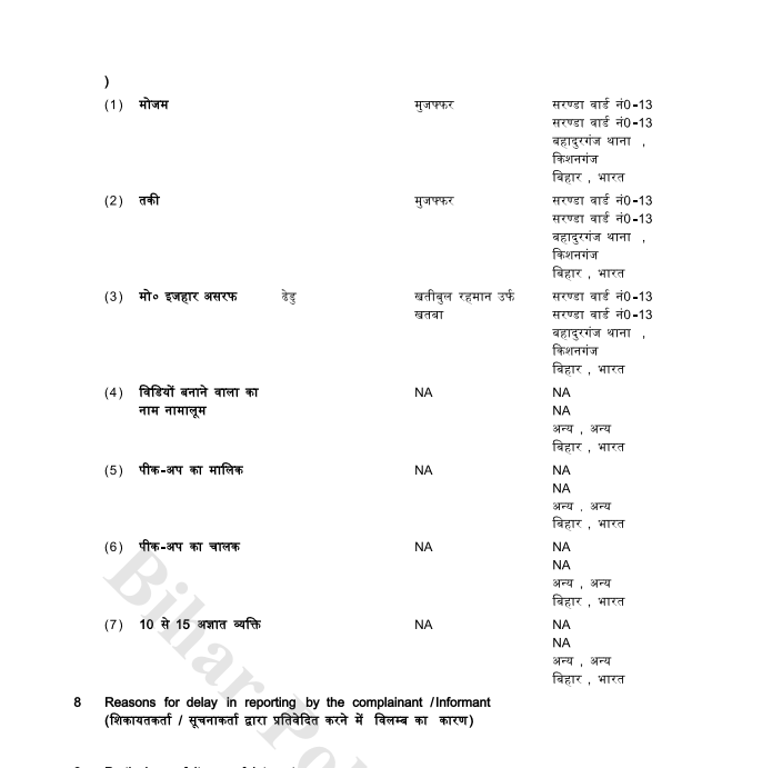 এফআইআরে উল্লেখ রয়েছে, প্রায় ১০-১৫ জন অভিযুক্তের বিরুদ্ধে অভিযোগ দায়ের হয়। তাদের মধ্যে মোজাম, টাকি ও মহম্মদ ইজহার আসরাফের নাম রয়েছে। অভিযোগে বলা হয়, কিশোরের নামে মিথ্যে চুরির অপবাদ দিয়ে, অভিযুক্তরা সারানদা গ্রামের একটি জনমানসহীন স্থানে তাকে তুলে নিয়ে যায়। তাকে ধর্ষণ করে এবং এরপর একটি লাইট পোস্টের সঙ্গে বেঁধে মারধর কর। কিশোরের মাথা-সহ সারা শরীরে লাঠি দিয়ে আঘাত করা হয়।