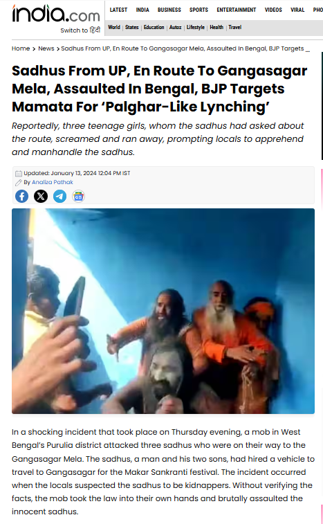 একই সময়, একই ছবি-সহ, India.com ওয়েবসাইটে প্রকাশিত প্রতিবেদন থেকে জানা যায় যে, মকর সংক্রান্তির সময় গঙ্গাসাগর মেলায় যাওয়ার সময়, পশ্চিমবঙ্গের পুরুলিয়া জেলায় তিনজন সাধুকে মারধরের ঘটনা ঘটেছিল। অভিযোগ অপহরণকারী সন্দেহে, স্থানীয়রা ওই সাধুদের মারধর করেছিল। ঘটনার ভিডিয়ো সোশ্যাল মিডিয়ায় ভাইরাল হতেই রাজ্য সরকারকে আক্রমণ করেছিল বিজেপি।