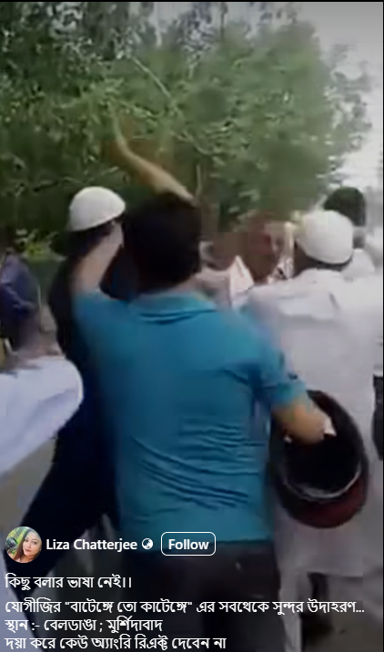 গত কয়েকদিন ধরে দুই গোষ্টীর সংঘর্ষে উত্তপ্ত মুর্শিদাবাদের বেলডাঙা। বহু ঘর-বাড়ি, দোকান ও যানবাহন ভাঙার এবং মারধরের অভিযোগ উঠেছে। বন্ধ করা হয়েছে এলাকার ইন্টারনেট ব্য়বস্থা। এ মত অবস্থায় সোশ্য়াল মিডিয়ায় ছড়িয়েছে একটি ভিডিয়ো যেখানে দেখা যাচ্ছে, কয়েকজন সংখ্য়ালঘু মানুষ দু’জন ট্রাফিক পুলিশকে মারধর করছে। অনেকেই ভিডিয়োটিকে মুর্শিদাবাদের বেলডাঙার ঘটনা বলে দাবি করেছেন এবং ফেসবুকে পোস্ট করেছেন।