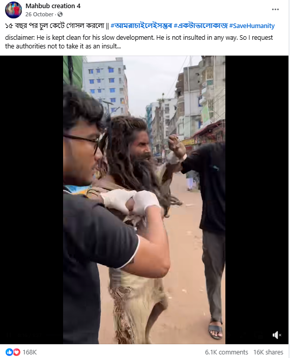 Mahbub creation 4 নামের ওই ফেসবুক পেজটিতে ২৬ অক্টোবর ভিডিয়োটি আপলোড করা হয়েছিল। যার শিরোনাম ছিল, “১৫ বছর পর চুল কেটে গোসল করলো || #আমরা চাইলেইসম্ভব #একটাভালোকাজ #SaveHumanity disclaimer: He is kept clean for his slow development. He is not insulted in any way. So I request the authorities not to take it as an insult…”।