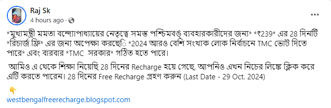 পশ্চিমবঙ্গবাসীর জন্য ২৩৯ টাকায় ২৮ দিনের ‘ফ্রি রিচার্জ’-এর সুবিধা দিচ্ছিলেন মুখ্যমন্ত্রী মমতা বন্দ্যোপাধ্যায়। যাতে প্রত্যেক রাজ্যবাসী শাসকদল তৃণমূল কংগ্রেসকে আরও বেশি করে ভোট দেন। (আর্কাইভ লিঙ্ক)