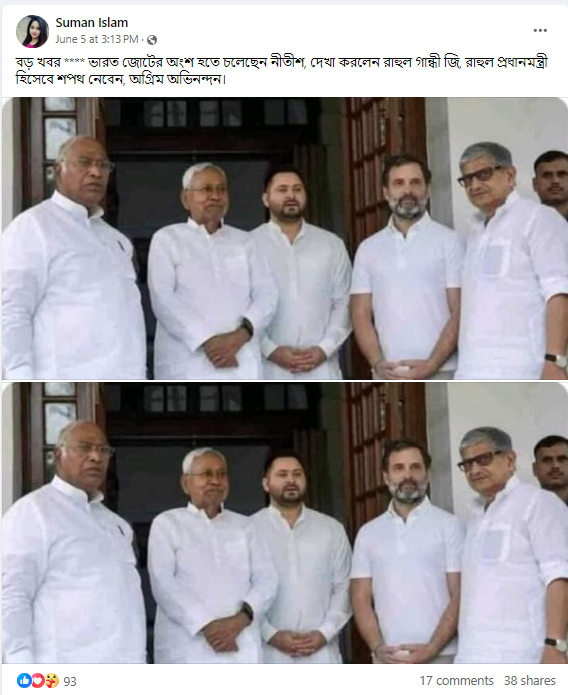 তৃতীয়বারের জন্য প্রধানমন্ত্রী হিসেবে নরেন্দ্র মোদির শপথ গ্রহণ কেবল সময়ের অপেক্ষা। শুক্রবার তাঁকে সংসদীয় নেতা হিসেবে নির্বাচিত করেছেন বিজেপি-সহ এনডিএ-র অন্যান্য জোটসঙ্গীরা। এই পরিস্থিতিতে এনডিএ জোটের অন্যতম গুরুত্বপূর্ণ সদস্য তথা বিহারের মুখ্যমন্ত্রী নীতিশ কুমারের একটি ছবি সোশ্যাল মিডিয়ায় খুব ভাইরাল হয়েছে। যেখান তাঁকে কংগ্রেসের নেতা রাহুল গান্ধী, মল্লিকার্জুন খাড়্গে এবং আরজেডি নেতা তেজস্বী যাদবের সঙ্গে একই ফ্রেমে দেখা যাচ্ছে। ছবিটি ফেসবুকে পোস্ট করে অনেকেই দাবি করেছেন যে, I.N.D.I জোটে যোগ দেওয়ার জন্য রাহুল, খাড়্গে ও তেজস্বীদের সঙ্গে বৈঠক করেছেন নীতিশ কুমার। ফেসবুকে লেখা হয়েছে, “বড় খবর **** ভারত জোটের অংশ হতে চলেছেন নীতীশ, দেখা করলেন রাহুল গান্ধী জি, রাহুল প্রধানমন্ত্রী হিসেবে শপথ নেবেন, অগ্রিম অভিনন্দন।” (আর্কাইভ লিঙ্ক)