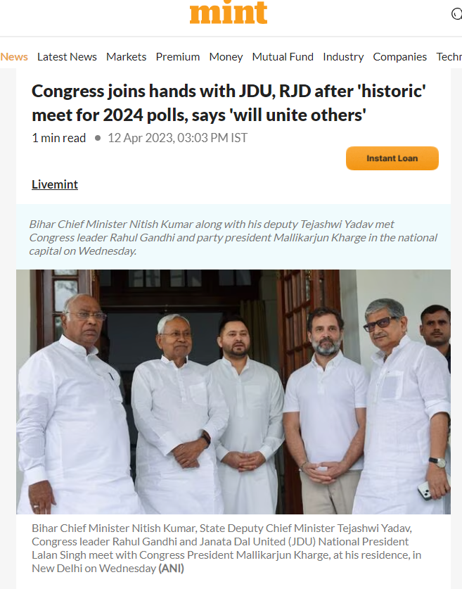 এরপর ভাইরাল ছবিটির রিভার্স ইমেজ সার্চ করলে দেখা যায়, একই ছবি ২০২৩ সালের ১২ এপ্রিল Livemint ওয়েবসাইটের একটি প্রতিবেদনে ব্যবহার করা হয়েছিল। ওই প্রতিবেদন থেকে জানা যায় যে, মোদি ও বিজেপি বিরোধী জোট তৈরির জন্য তখন দিল্লিতে, কংগ্রেস নেতা রাহুল গান্ধী, মল্লিকার্জুন খাড়্গে এবং আরজেডি নেতা তেজস্বী যাদবের সঙ্গে বৈঠক করেছিলেন নীতিশ কুমার।