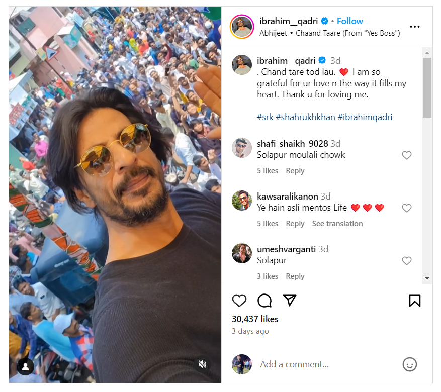 এরপর আরও তদন্ত করে ইব্রাহিম কাদরি, যাঁকে শাহরুখ খানের মতো দেখতে, তাঁর ইনস্টাগ্রাম হ্যান্ডেলটি আমরা খুঁজে পাই। দেখা যায়, ২২ এপ্রিল নিজের ইনস্টাগ্রামে কংগ্রেস প্রার্থী প্রণতি শিন্ডের হয়ে ভোটপ্রচারের ভিডিয়ো পোস্ট করেছিলেন ইব্রাহিম কাদরি।