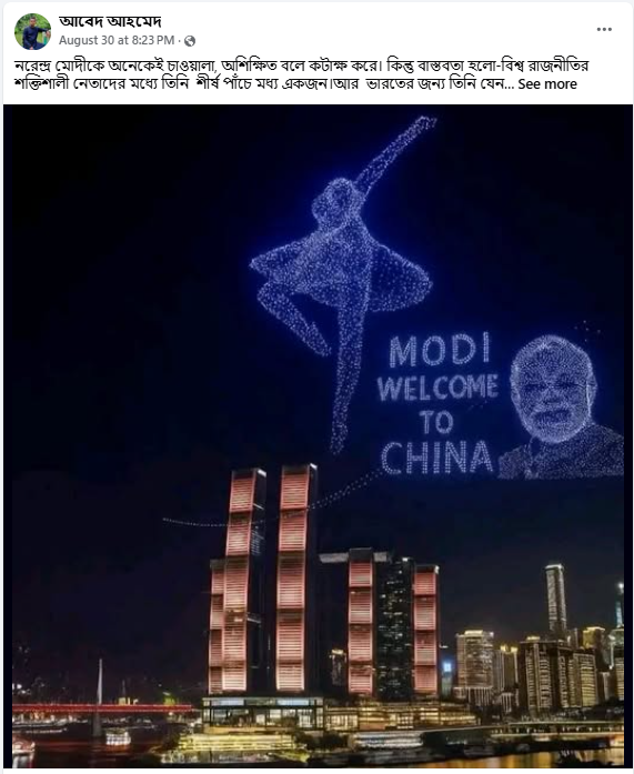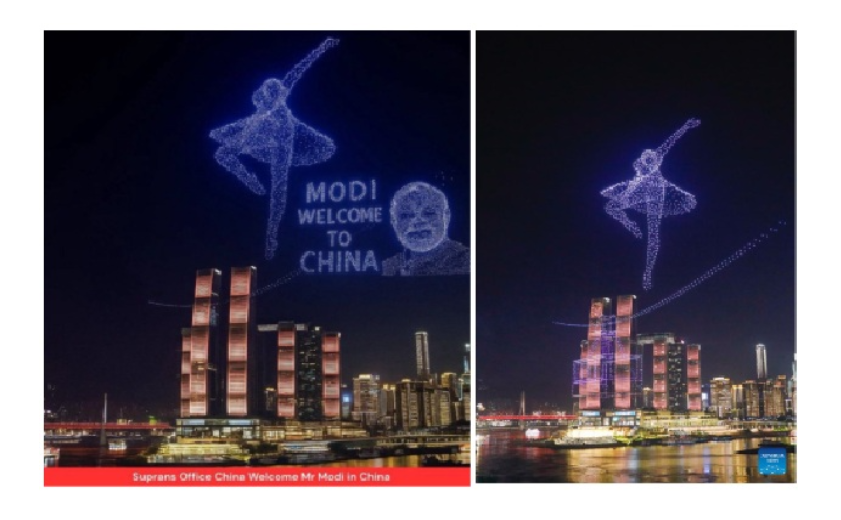 ২০২৫ সালের ২০ এপ্রিল, চিনের সরকারি সংবাদমাধ্যম Xinhua ছবিটি প্রকাশিত হয়েছিল। যেখানে ড্রোন শো-তে আকাশে এক নারীর নাচের ভঙ্গি তৈরি করা হয়েছিল। মোদীর মুখের কোনও প্রতিকৃতি সেখানে ছিল না।