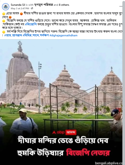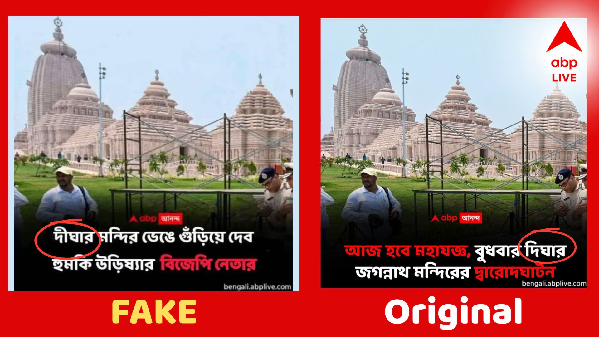 দিঘায় নবনির্মিত জগন্নাথ ধাম (Digha Jagannath Temple) ভেঙে গুঁড়িয়ে দেওয়ার হুমকি দিয়েছেন ওড়িশার এক বিজেপি নেতা। এই খবর সম্বলিত একটি নিউজকার্ড প্রকাশ করেছে বাংলা সংবাদমাধ্যম ABP Ananada।