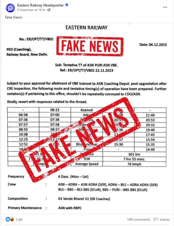 1. Facebook post by Eastern Railway Headquarter, dated December 6, 2023