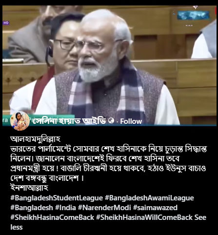সংবাদ সংস্থা ANI ও BJP -এর অফিসিয়াল ইউটিউব চ্যানেলেও প্রধানমন্ত্রীরভাষণের একই ভিডিয়ো দেখতে পাওয়া যায়। তবে কোনও ভাষণেই মোদীকে, বাংলাদেশের প্রাক্তন প্রধানমন্ত্রীকে নিয়ে একটা লাইনও উচ্চারণ করতে শোনা যায়নি।