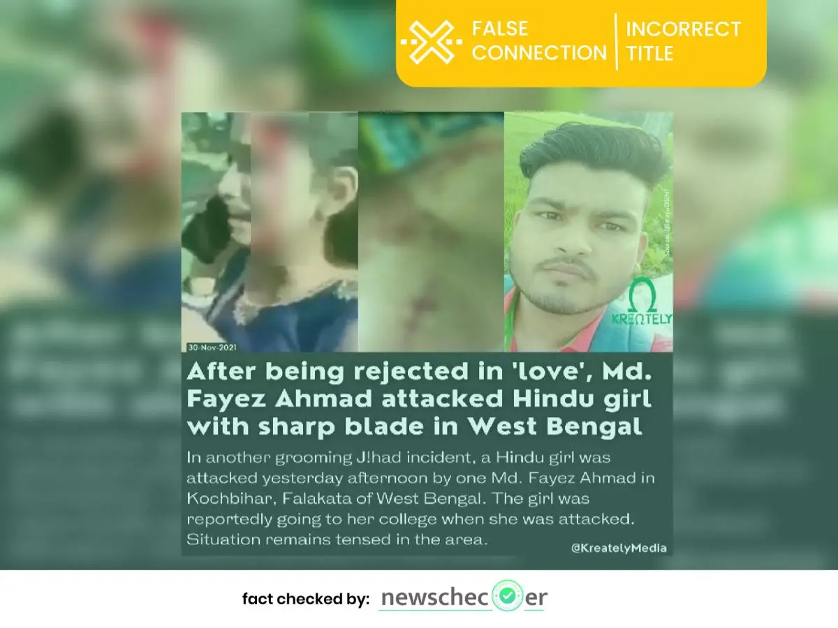 টুইটারে সম্প্রতি একটি পোস্ট ভাইরাল হয়েছে পশ্চিমবঙ্গের ঘটনা নিয়ে যেখানে দাবি করা হয়েছে প্রেম প্রত্যাখ্যান করায় হিন্দু প্রেমিকার গায়ে ব্লেড চালালো মুসলিম প্রেমিক। টুইটারে ছড়িয়েছে যুগলের ছবিও যেখানে বলা হচ্ছে মেয়েটি হিন্দু এবং তার প্রেমিক মুসলিম নাম মোহম্মদ ফায়াজ আহমেদ। টুইটারে #Love_Nahi_Jeehad_Hai হ্যাশট্যাগ সমেত এই পোস্টটি ছড়িয়েছে। ভাইরাল পোস্টে KreatelyMedia থেকে ৩০শে নভেম্বরে এই খবরটি বেরিয়েছিল। সেই খবরের পোস্টটকার্ডই এখন টুইটারে ভাইরাল।