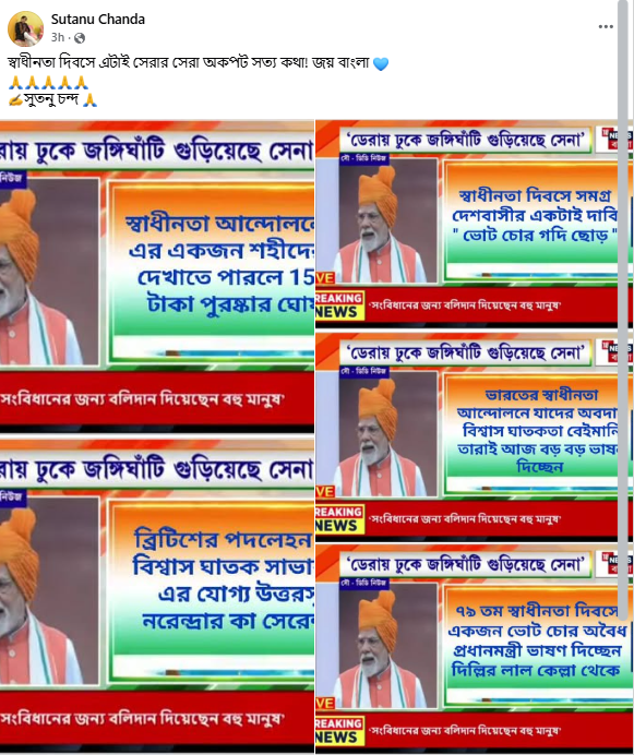 প্রধানমন্ত্রীর ভাষণ দেওয়ার ছবি-সহ স্ক্রিনশটগুলোতে লেখা রয়েছে, “স্বাধীনতা আন্দোলনে RSS এর একজন শহীদের ছবি দেখাতে পারলে 15 লক্ষ টাকা পুরষ্কার ঘোষণা”, “ব্রিটিশের পদলেহন কারি বিশ্বাস ঘাতক সাভারকার এর যোগ্য উত্তরসূরী নরেন্দ্রার কা সেরেন্ডার”, “স্বাধীনতা দিবসে সমগ্র দেশবাসীর একটাই দাবি ” ভোেট চোর গদি ছোড়”, “ভারতের স্বাধীনতা আন্দোলনে যাদের অবদান বিশ্বাস ঘাতকতা বেইমানি তারাই আজ বড় বড় ভাষন দিচ্ছেন”, “৭৯ তম স্বাধীনতা দিবসে একজন ভোেট চোর অবৈধ প্রধানমন্ত্রী ভাষণ দিচ্ছেন দিল্লির লাল কেল্লা থেকে”। (বানান অপরিবর্তিত রাখা হয়েছে)