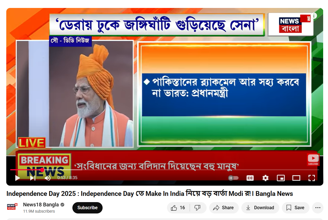 তদন্তের শুরুতে আমরা News 18 Bangla-র অফিসিয়াল ইউটিউব চ্যানেলে, প্রধানমন্ত্রী নরেন্দ্র মোদীর (PM Narendra Modi), ৭৯তম স্বাধীনতা দিবসে (Independence Day) ভাষণের লাইভ ভিডিয়োতে খতিয়ে দেখি। ১ ঘণ্টা ২৬ মিনিট দীর্ঘ, সেই ভিডিয়োর কোনও প্রধানমন্ত্রীকে ভাইরাল স্ক্রিনশটে থাকা বক্তব্যগুলো বলতে শোনা যায়নি।