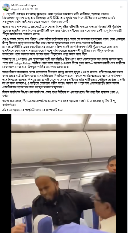 ভাইরাল ভিডিয়োটির একটি কি-ফ্রেমের রিভার্স ইমেজ সার্চ করলে দেখা যায়, ৩ অগাস্ট, ২০২৫ তারিখে, একই ধরনের একটি ছবি-সহ প্রতিবেদন প্রকাশ করেছিল Live Mint ওয়েবসাইটটি। ওই প্রতিবেদন থেকে জানা যায় যে, মুম্বই থেকে কলকাতাগামী ইন্ডিগোর 6E-2387 বিমানে, হোসেন আহমেদ মজুমদার নামে এক ব্যক্তি যাত্রা করেন। যিনি আসলে অসমের বাসিন্দা। ওই বিমানের মধ্যে তাঁর প্যানিক অ্যাকাট হয়। সেই সময় হাফিজুল রহমান নামে ব্যক্তির বিরুদ্ধে, তাঁকে চড় মারার অভিযোগ ওঠে (Indigo Slap Incident)। অন্যান্য যাত্রী ও কেবিনক্রুরা পরিস্থিতি সামাল দেওয়ার চেষ্টী করে। কিন্তু মুহূর্তের মধ্যে সোশ্যাল মিডিয়ায় সেই ভিডিয়ো ভাইরাল হয়ে যায়।