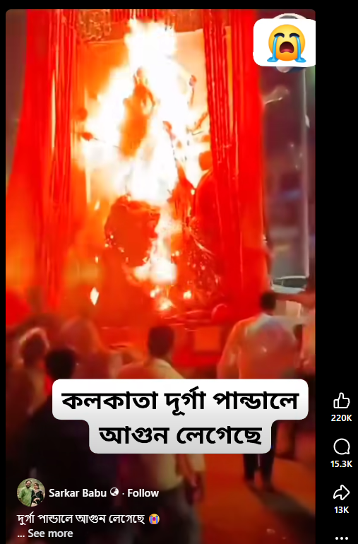 একটি ভিডিয়ো সোশ্যাল মিডিয়ায় পোস্ট করে দাবি করা হয়েছে যে, কলকাতার দুর্গাপুজো প্যান্ডেলে আগুন লেগেছে।