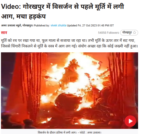 ভাইরাল ভিডিয়োর কি-ফ্রেমের রিভার্স ইমেজ সার্চ করলে দেখা যায় যে, ২০২৩ সালের ২৭ অক্টোবর, একই ধরনের ছবি-সহ একটি প্রতিবেদন, Amar Ujala-র ওয়েবসাইটে প্রকাশিত হয়েছিল। সেই প্রতিবেদন থেকে জানা যায় যে, উত্তরপ্রদেশের গোরক্ষপুর জেলার কুনারাঘাট এলাকায় মূর্তিতে আগুন লাগার ঘটনাটি ঘটেছিল। পরে পুলিশের সহায়তায় আগুন নিয়ন্ত্রণে এসেছিল।
