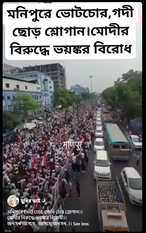 ফেসবুকে ভিডিয়োটি পোস্ট করে লেখা হয়েছে, “মনিপুরে ভোট চোর, গোদি চোর স্লোগান।। মোদীর বিরুদ্ধে ভয়ঙ্কর বিরোধী।। জনগন জাগছে.. জাগছে জনগন..।”