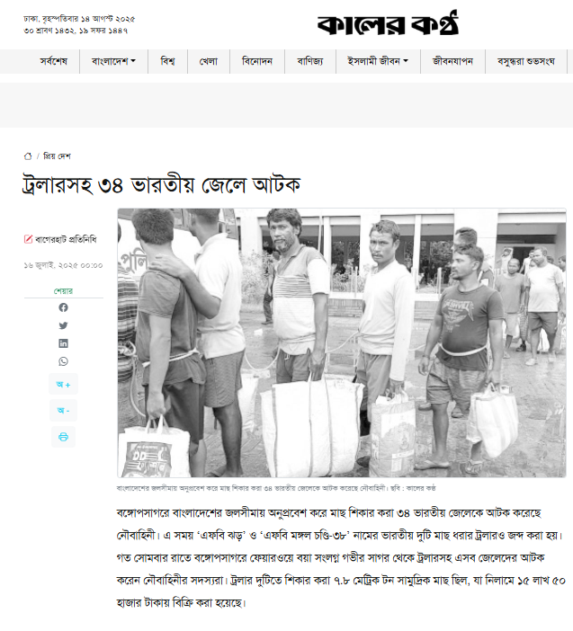ভাইরাল ভিডিয়োর একটি কি-ফ্রেমের রিভার্স ইমেজ সার্চ করলে দেখা যায় যে, চলতি বছরের ১৬ জুলাই, একই ফ্রেমের একটি ছবি-সহ, বাংলাদেশি সংবাদমাধ্যম Kaler Kantho-র ওয়েবসাইটে, একটি প্রতিবেদন প্রকাশিত হয়েছিল। ওই প্রতিবেদন থেকে জানা যায় যে, বঙ্গোপসাগরে বাংলাদেশের জলসীমায় অনুপ্রবেশ করার অভিযোগে, ৩৪ ভারতীয় মৎস্যজীবীকে আটক করেছিল বাংলাদেশি নৌবাহিনী। একইসঙ্গে ‘এফবি ঝড়’ ও ‘এফবি মঙ্গল চণ্ডি-৩৮’ নামের দুটো ভারতীয় ট্রলারও আটক করা হয়েছিল। ট্রলার দুটিতে ৭.৮ মেট্রিক টন মাছ ছিল, যা নিলাম করে ১৫ লাখ ৫০ হাজার টাকা পাওয়া গিয়েছিল।
