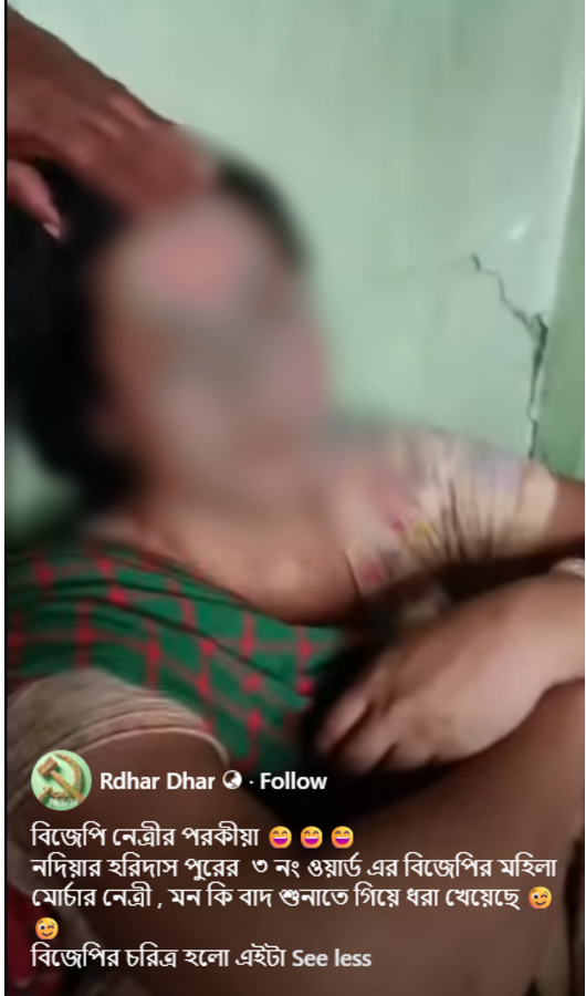 সোশ্যাল মিডিয়ায় একজন মহিলা ও যুবকের বসে থাকার ভিডিয়ো পোস্ট করে দাবি করা হয়েছে যে, নদীয়ার হরিদাসপুরের ৩ নম্বর ওয়ার্ডে, বিবাহবহির্ভূত সম্পর্কে জড়িয়ে ধরা পড়েছেন একজন বিজেপি নেত্রী।