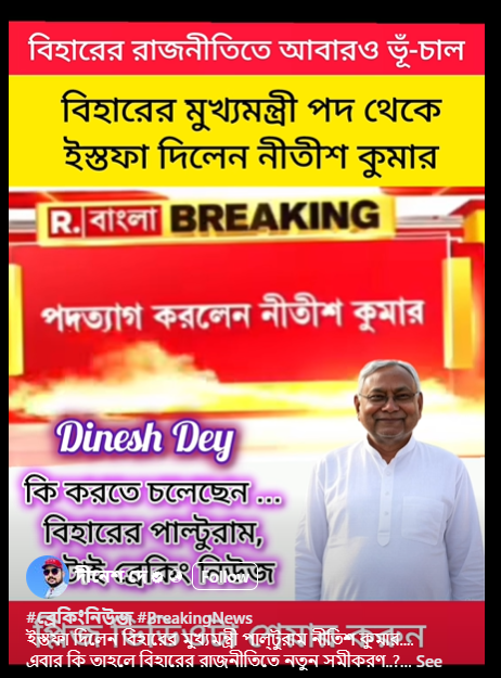 রিপাবলিক বাংলার একটি নিউজ ক্লিপ সোশ্যাল মিডিয়ায় ছড়িয়ে দাবি করা হচ্ছে যে, বিহারের মুখ্যমন্ত্রী পদ থেকে ইস্তফা দিয়েছেন নীতিশ কুমার এবং বিষয়টিকে সাম্প্রতিক বলা হচ্ছে।